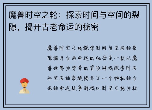 魔兽时空之轮:探索时间与空间的裂隙,揭开古老命运的秘密