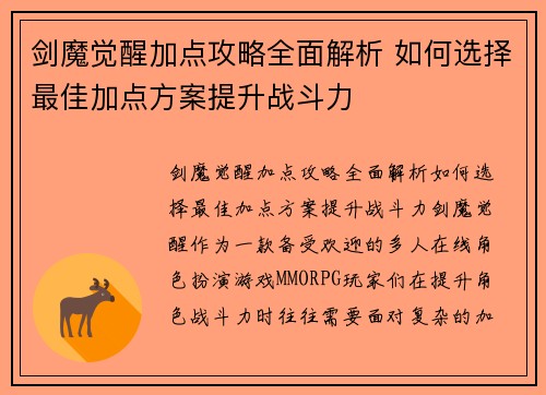 剑魔觉醒加点攻略全面解析 如何选择最佳加点方案提升战斗力